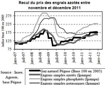 Le prix des engrais simples azotés se replie légèrement entre novembre et décembre 2011 ; ceux des engrais phosphatés et potassiques sont relativement stables.