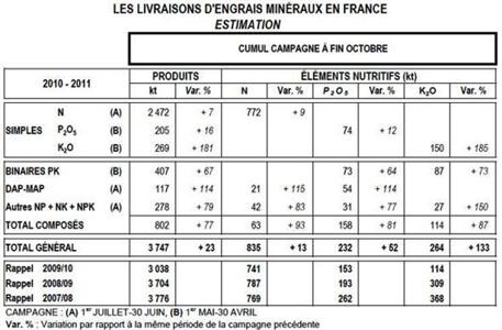 amendements de fond, se confirme après deux années consécutives de baisse. L’écart de la consommation générale, à fin octobre, entre la campagne 2007/2008 (référence avant la chute de la consommation) et 2010/2011 est de moins de 30 kt d’engrais. La consommation d’azote est plus importante (835 kt sur 2010/2011 contre 769 kt sur 2007/2008). Concernant la potasse et le phosphore, les niveaux de consommation se redressent (cf. tableau : les livraisons d’engrais minéraux en France, source Unifa).