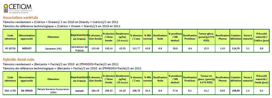 ![]() Inscriptions colza 2012 lignées et hybrides restaurés. Cliquer pour agrandir. (© Cetiom) |