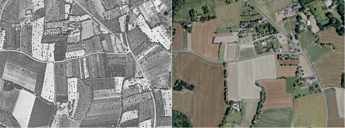 Afin d’augmenter la productivité des fermes, le remembrement a été mis en place par l’État, de gré ou de force. Les haies ont été arrachées pour assembler de petites parcelles voisines en une grande, permettant ainsi d’augmenter la surface cultivable et de simplifier le travail des agriculteurs.