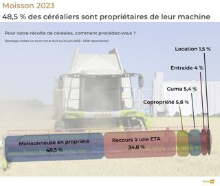 Juste avant que ne démarre la moisson mi-juin, la rédaction s’est posé la question de savoir à qui appartiennent les moissonneuses qui fauchent la récolte 2023. Résultat : 48,5 % des céréaliers sont propriétaires de leur machine. Un chiffre qui progresse doucement mais sûrement ces dernières années. En 2019 et 2015, ils étaient respectivement 47,2 % et 45,4 % à déclarer en être propriétaire.