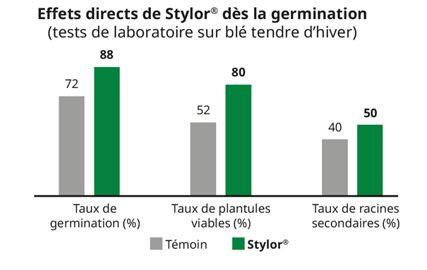 Les résultats montrent des effets significatifs sur la densité et l’homogénéité du peuplement, permettant aux cultures d’exprimer pleinement leur potentiel de rendement. STYLOR® sécurise l’implantation et constitue une véritable garantie pour un début de cycle réussi.