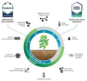 - Technologie GoActiv®, filtrat d’algues d’Ascophyllum nodosum, reconnu pour ses propriétés stimulantes sur la nutrition et l’activité chlorophyllienne, optimise la disponibilité des éléments nutritifs et favorise une croissance active, même dans des conditions limitantes.