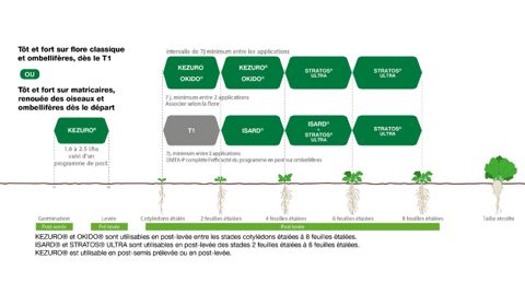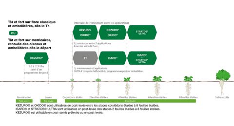 Désherbage de pré-levée pour contrôler précocement les adventices et sécuriser le désherbage. De plus, il est le meilleur moyen de contrôler la matricaire, les renouées des oiseaux et les ombellifères, l’ammi élevé (Ammi majus), qui concurrence fortement la betterave dès le départ.