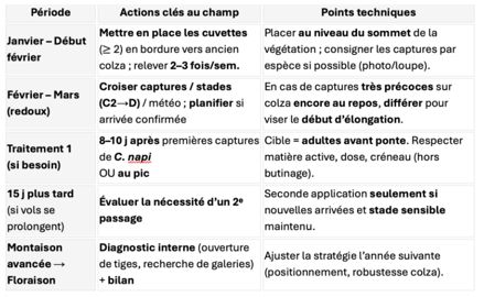 Objectif : tuer les adultes avant la ponte. Intervenir 8 à 10 jours après les premières captures significatives, sauf si le colza est encore au repos végétatif (dans ce cas, différer l’intervention).
