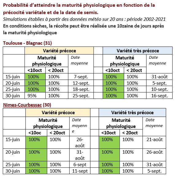 Les simulations établies à partir des données météo de plusieurs stations sur les 20 dernières années : période 2002-2021, permettront de conforter votre décision. En conditions sèches, la récolte peut être réalisée une dizaine de jours après la maturité physiologique.