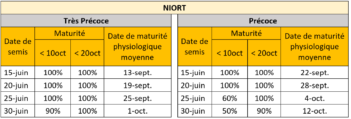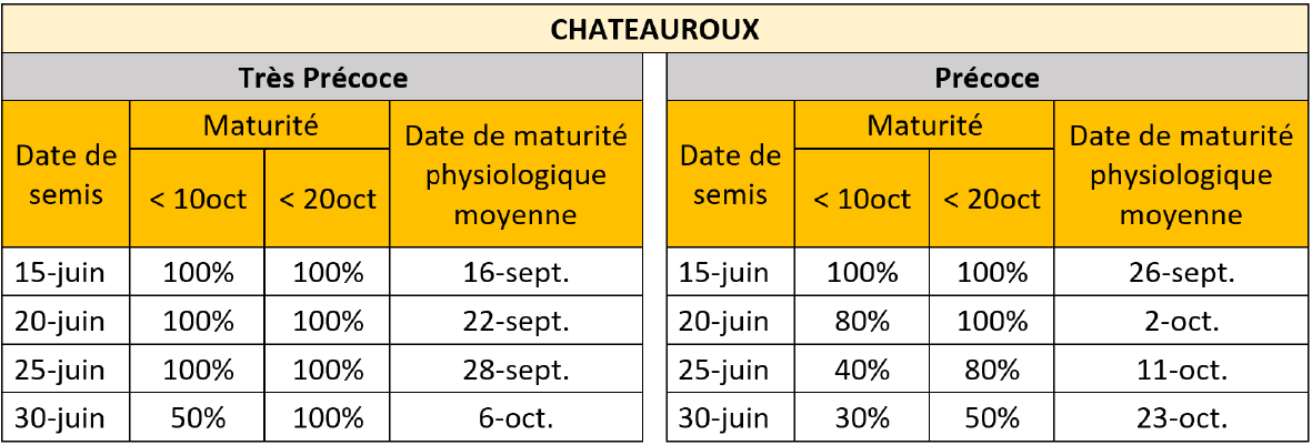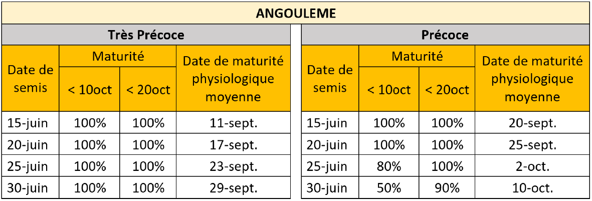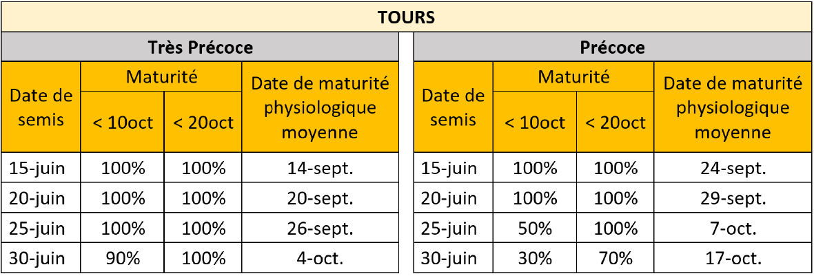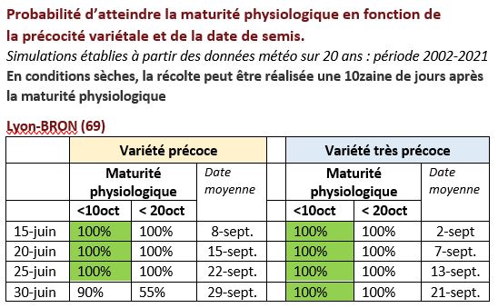 - Choisir une variété précoce ou très précoce selon votre situation géographique. Voir ci-dessous les simulations pour atteindre la maturité physiologique en fonction de la date de semis/précocité.