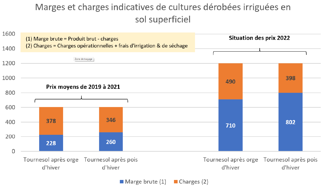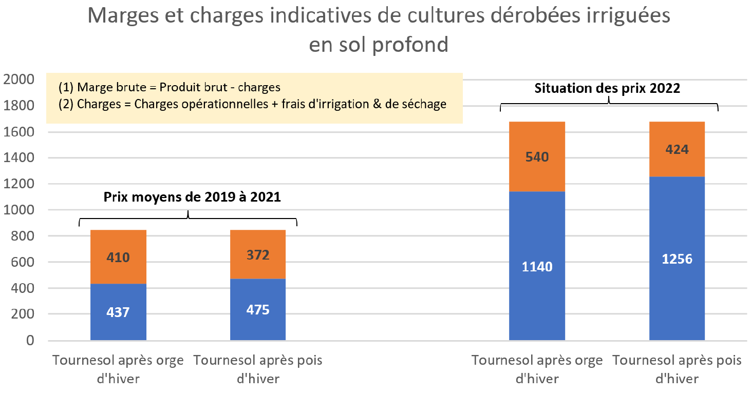 Quelle que soit la classe de profondeur de sol (profond, intermédiaire ou superficiel), le contexte 2022 est économiquement particulièrement propice à la culture de tournesol en dérobé, mais aussi de soja. En effet, la croissance du produit brut prévisionnel observée entre les prix moyens de 2019 à 2021 et ceux de 2022 est plus importante que l’augmentation des charges (charges opérationnelles + frais d’irrigation et de séchage)
