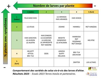 Terres Inovia évalue également le comportement des variétés vis-à-vis des attaques de larves d’altises. Pour proposer une classification, les équipes s’appuient sur deux variables : des mesures d’infestation larvaire via la méthode Berlèse et des comptages de plantes buissonnantes avant la floraison. « Là encore, c’est important de conserver ces deux variables. En effet, certaines variétés présentent deux fois plus de larves que d’autres dans un même essai, mais n’expriment cependant pas la même gravité de symptômes avec moins de plantes buissonnantes. »